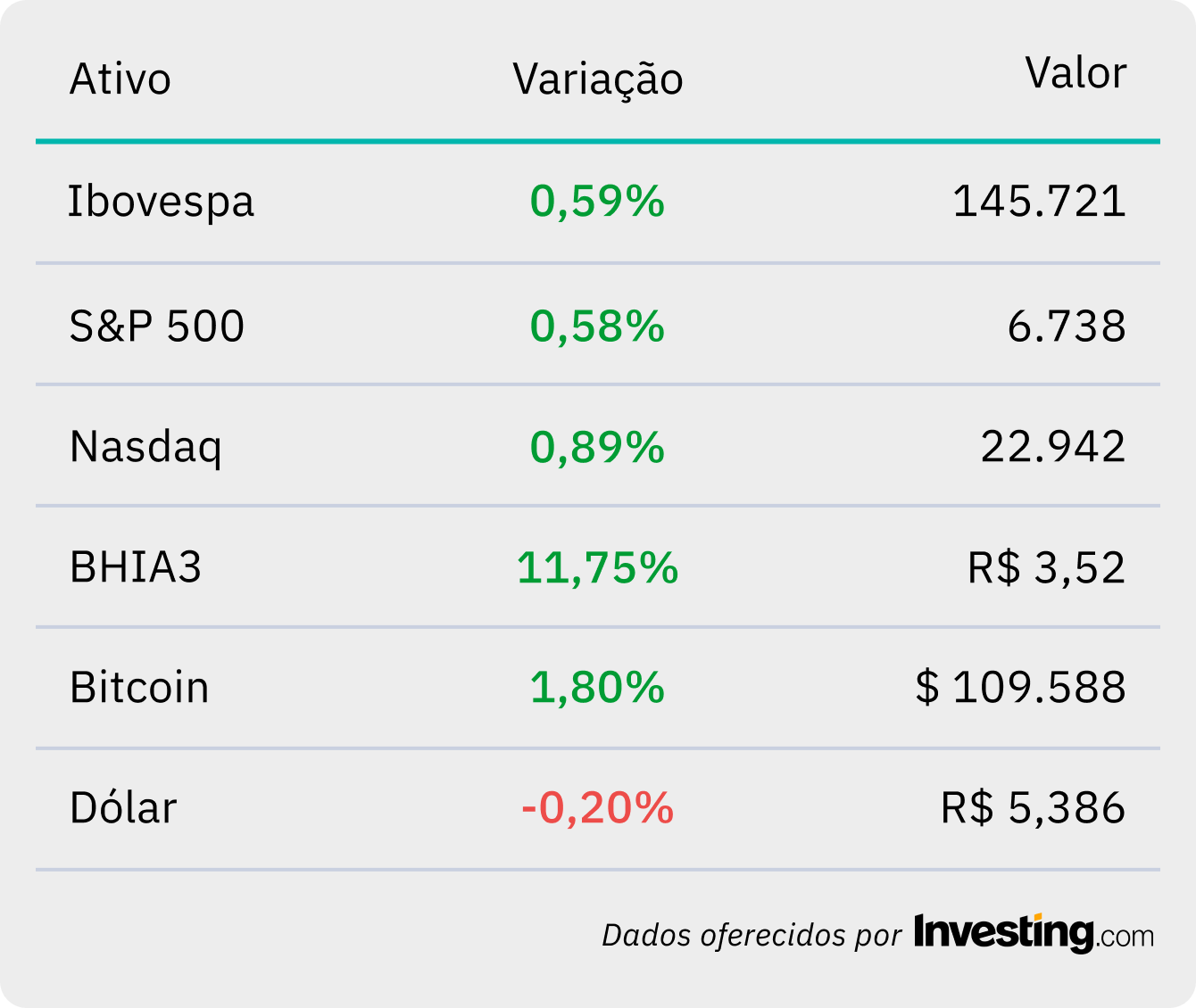 No Brasil, as ações da Casas Bahia (BHIA3) subiram 11,75% após o anúncio de uma parceria com o Mercado Livre. A notícia também pressionou os papéis da concorrente Magazine Luiza (MGLU3), que recuaram -5,64%.