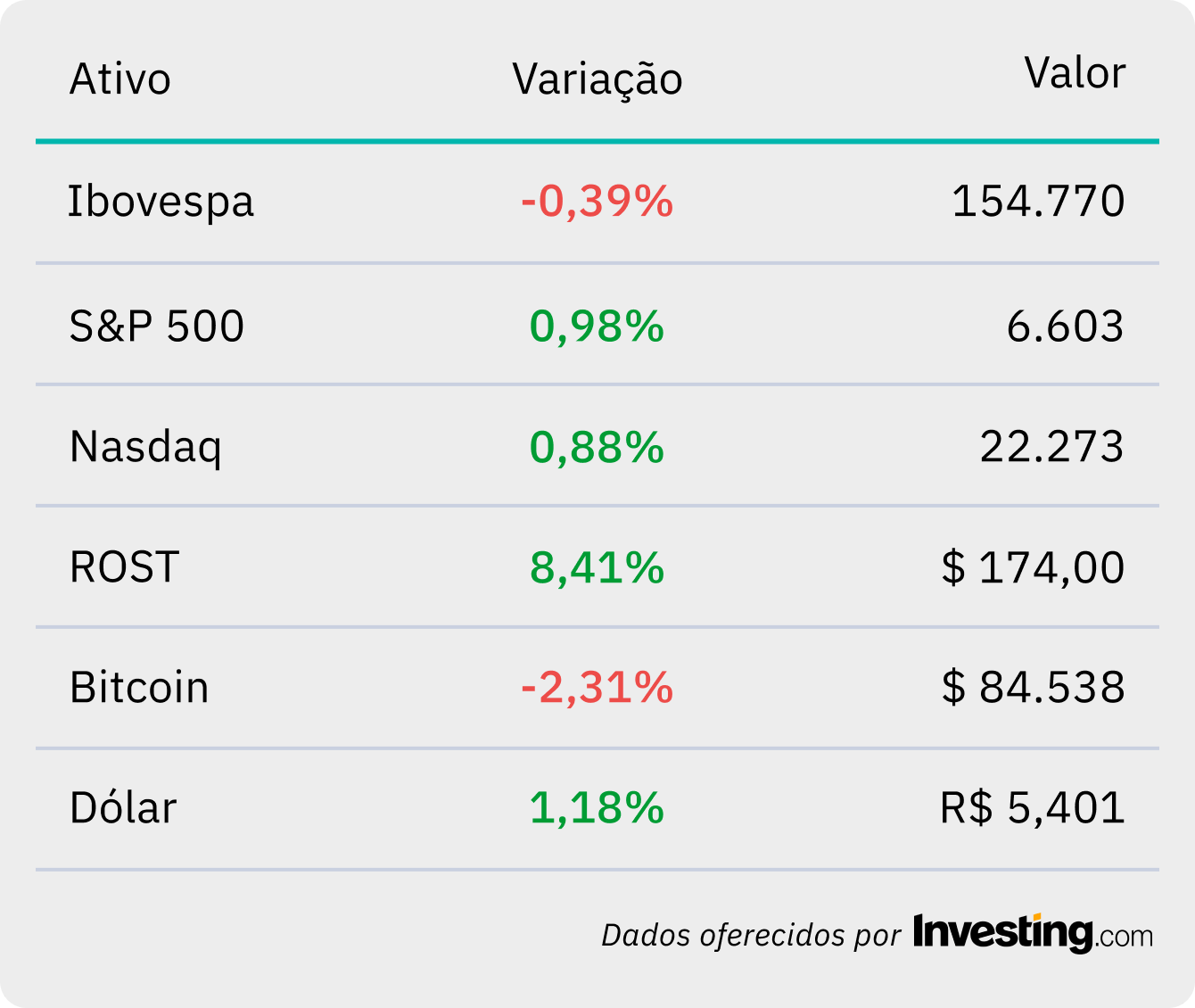 Entre as ações, a Ross Stores (ROST) subiu 8,41% após divulgar resultados acima do esperado e elevar suas projeções para o ano. A empresa é uma das maiores redes americanas de off-price, conhecida por vender roupas e itens de marca com grandes descontos, sob o lema “DRESS FOR LESS”. 👗