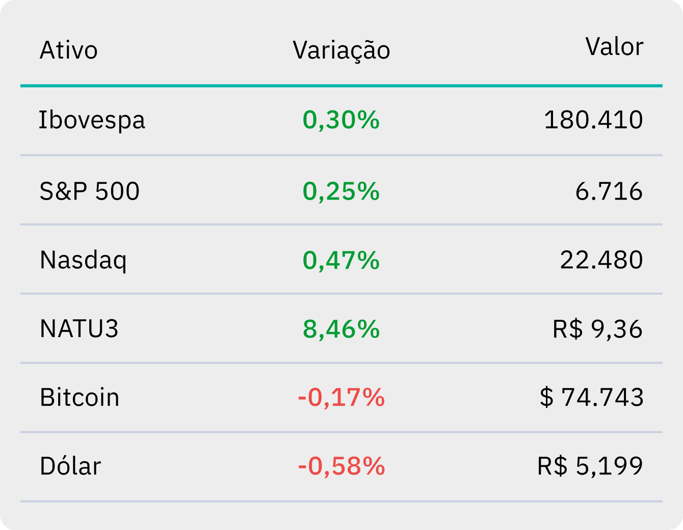 Entre as ações, a Natura (NATU3) disparou 8,46% após divulgar seus resultados do 4º trimestre de 2025. Segundo analistas da XP, o destaque positivo foi o controle das despesas com vendas, o que fez o lucro operacional superar as expectativas.