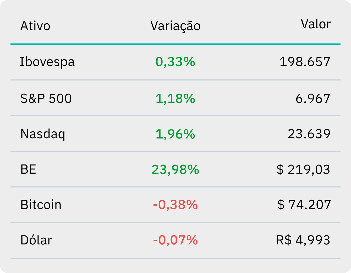 Entre as ações, a Bloom Energy (BE) disparou 23,98% após anunciar um acordo com a Oracle para fornecer até 2,8 gigawatts de energia para data centers de IA. A Oracle (ORCL), por sua vez, subiu 4,74%. 📈